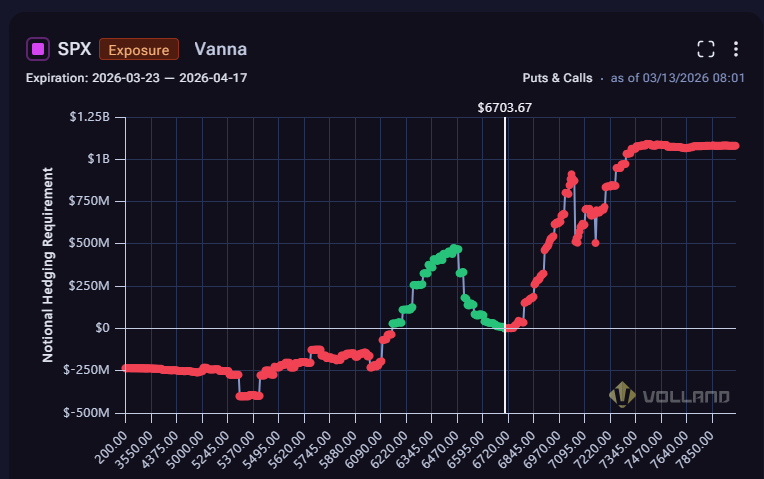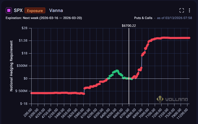 Next week for opex and FOMC, we see strong positive aggregate vanna. However, the support that once was at 6700 has been reduced. Yesterday’s non-vol event was supported by a slight decrease in support below and further reduction in this week’s aggregate vanna. I think next week can produce a relief rally.